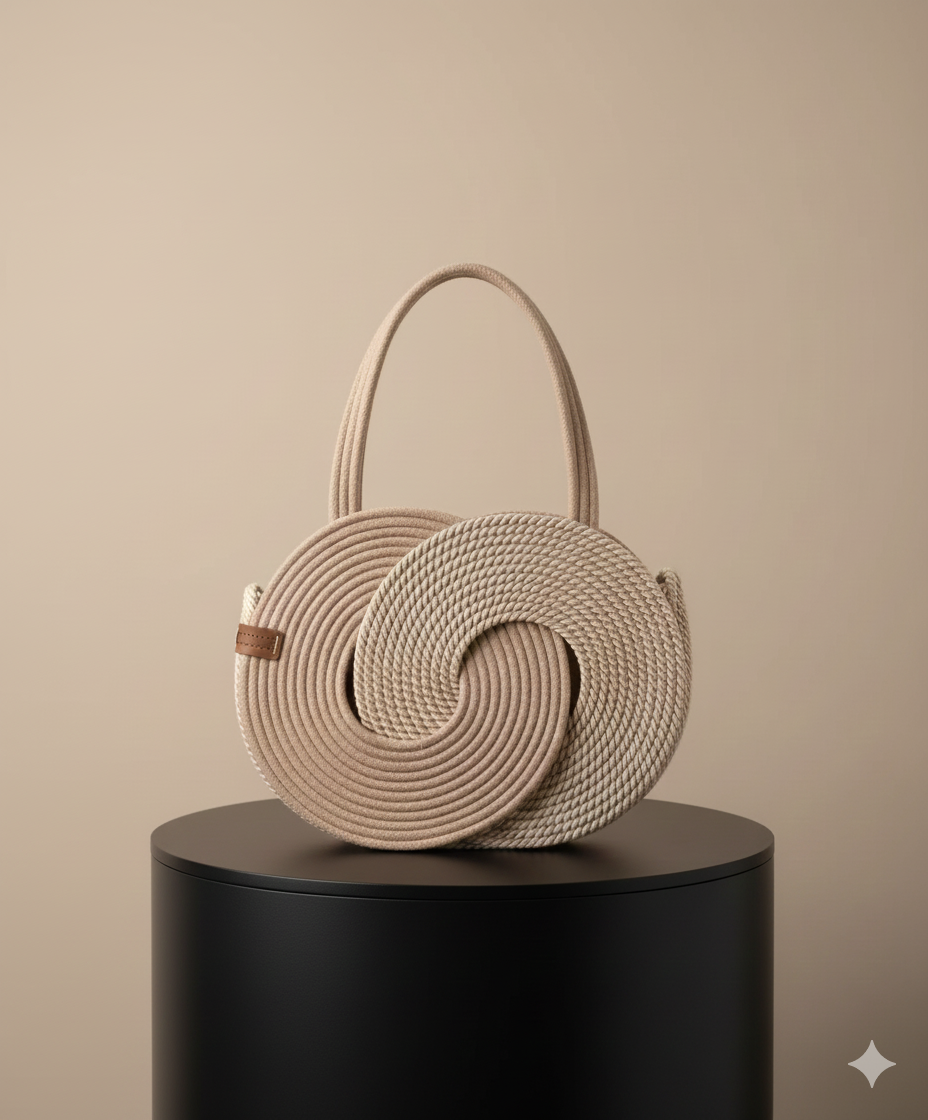 The Aura Knot Handbag is a sculptural statement piece crafted from finely coiled rope, blending contemporary design with artisanal craftsmanship. Its intertwined circular form creates a striking visual balance, while the soft neutral tone makes it effortlessly versatile for both day and evening wear. Lightweight yet structured, this handbag is designed for those who appreciate minimalism with a bold artistic edge.