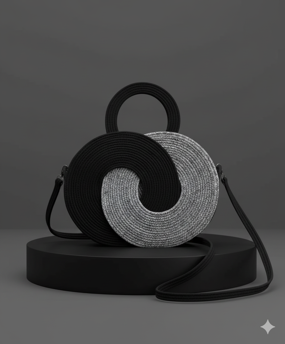 Make a bold style statement with the Midnight Grey Spiral Handmade Sling Bag, a perfect blend of modern design and artisanal craftsmanship. Handwoven using high-quality corded fiber, this bag features a striking circular spiral pattern in contrasting black and grey tones that instantly elevates any outfit.