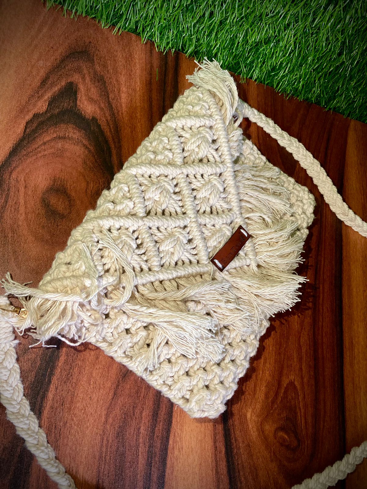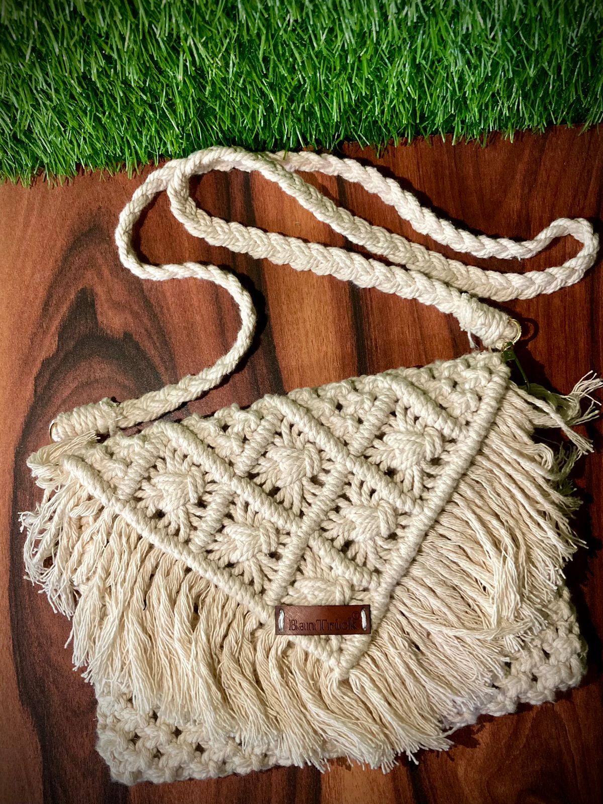 Bantrick off white handmade macrame bag would be an intricately woven piece, often using knotting techniques to create a unique and stylish design. The black color gives it a versatile and elegant look, suitable for various outfits and occasions. It might feature a combination of patterns and textures, with possible embellishments like beads or fringes to enhance its aesthetic appeal. The bag would likely have a soft, flexible structure due to the nature of the macrame technique, and could come with handles or a strap for easy carrying.